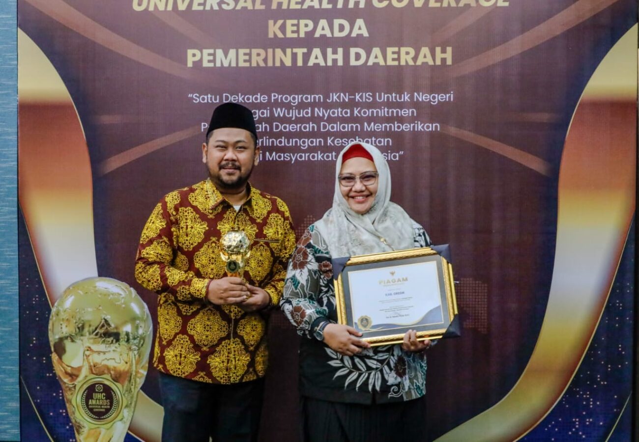 Merdekapostnews.com – Jakarta – Bupati Gresik, Fandi Akhmad Yani didampingi Wakil Bupati Aminatun Habibah mendapat penghargaan Universal Health Coverage (UHC) Awards 2024 tingkat utama dari Wakil Presiden Republik Indonesia, KH Ma’ruf Amin. Penghargaan diberikan atas prestasi dan komitmen dalam mendaftarkan penduduknya pada program Jaminan Kesehatan Nasional (JKN).