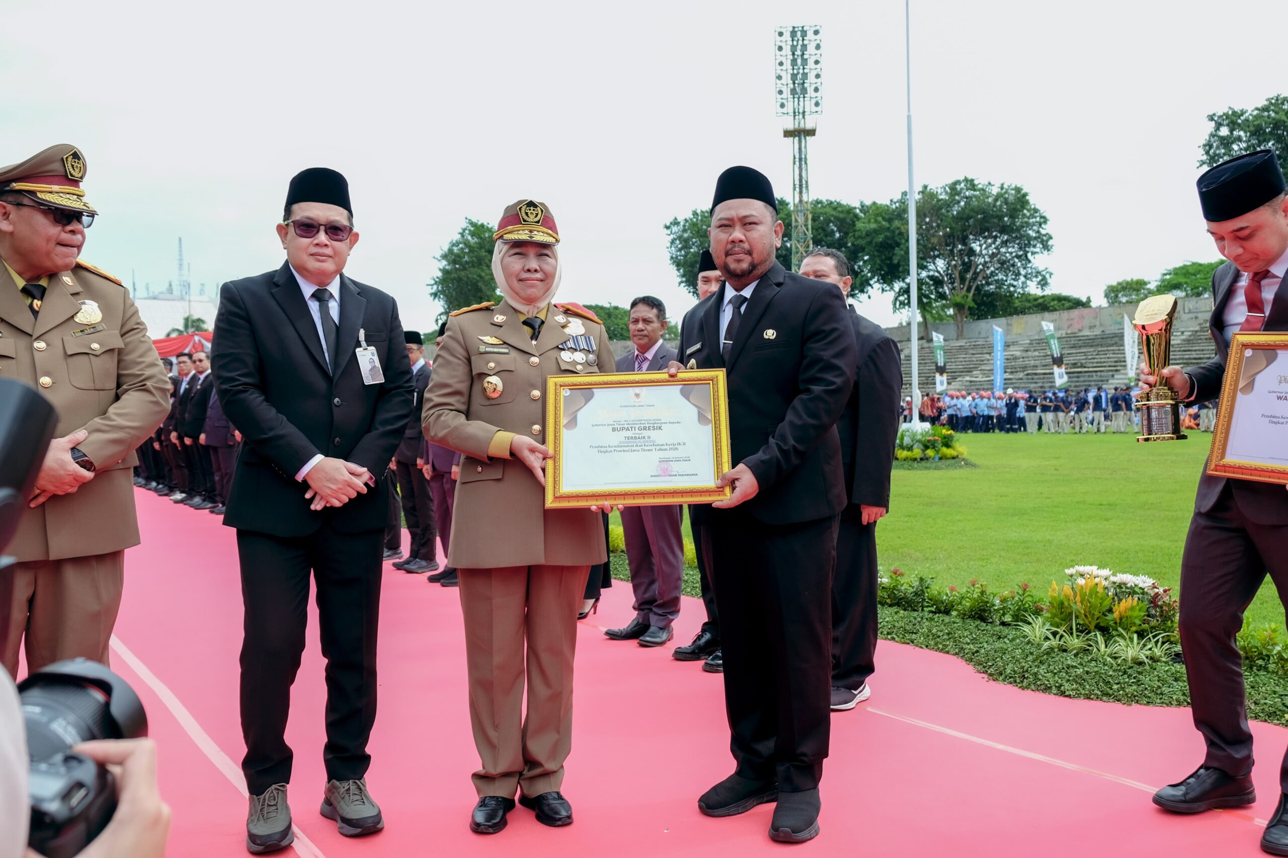 Merdekapostnews.com – Gresik,Jatim – Bupati Gresik Fandi Akhmad Yani menerima penghargaan sebagai Terbaik II Pembina Keselamatan dan Kesehatan Kerja (K3) tingkat Provinsi Jawa Timur. Penghargaan diserahkan langsung oleh Gubernur Jawa Timur Khofifah Indar Parawansa saat apel peringatan Bulan K3 Nasional yang digelar di Stadion Petrokimia Gresik, Rabu (14/1/2026).